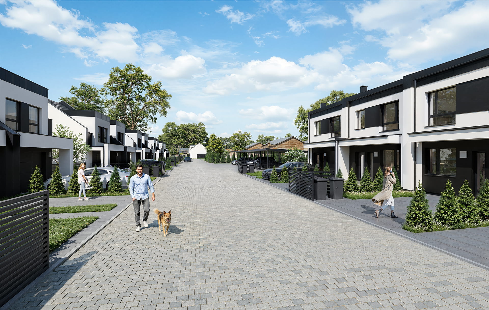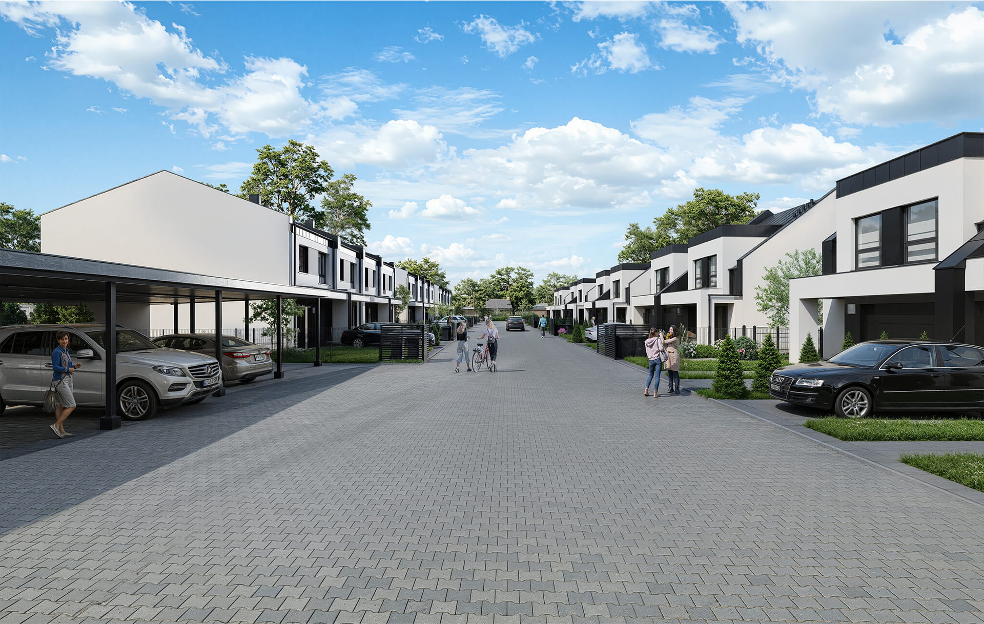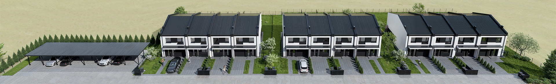 Osiedle wyposażone będzie w wybrukowaną drogę wewnętrzną, a przed każdym domem znajdować będzie się podjazd na samochód i chodnik doprowadzający do drzwi wejściowych. Nasze projekty charakteryzuje funkcjonalny układ pomieszczeń oraz rewelacyjne doświetlenie zapewnione przez duże przeszklenia.