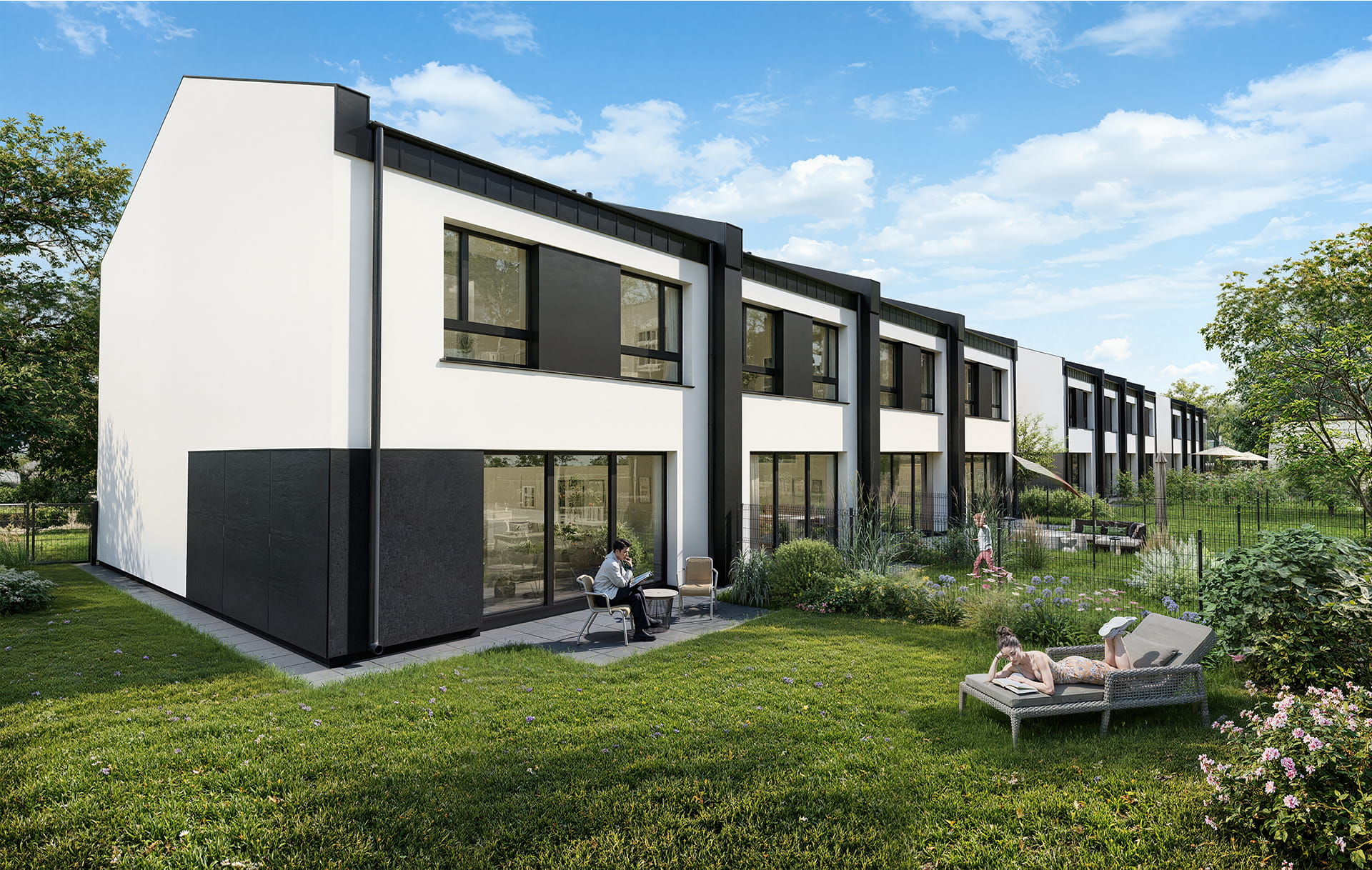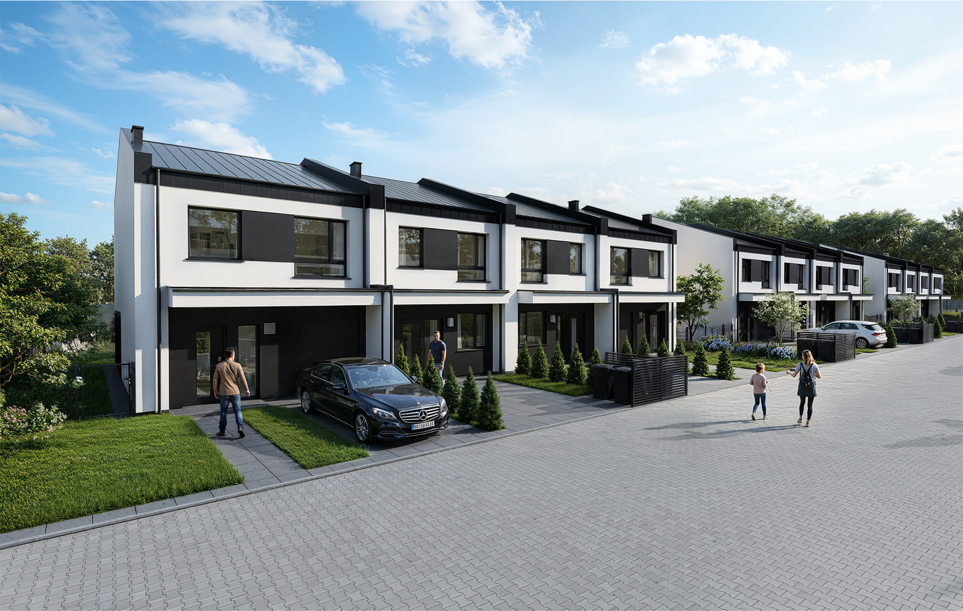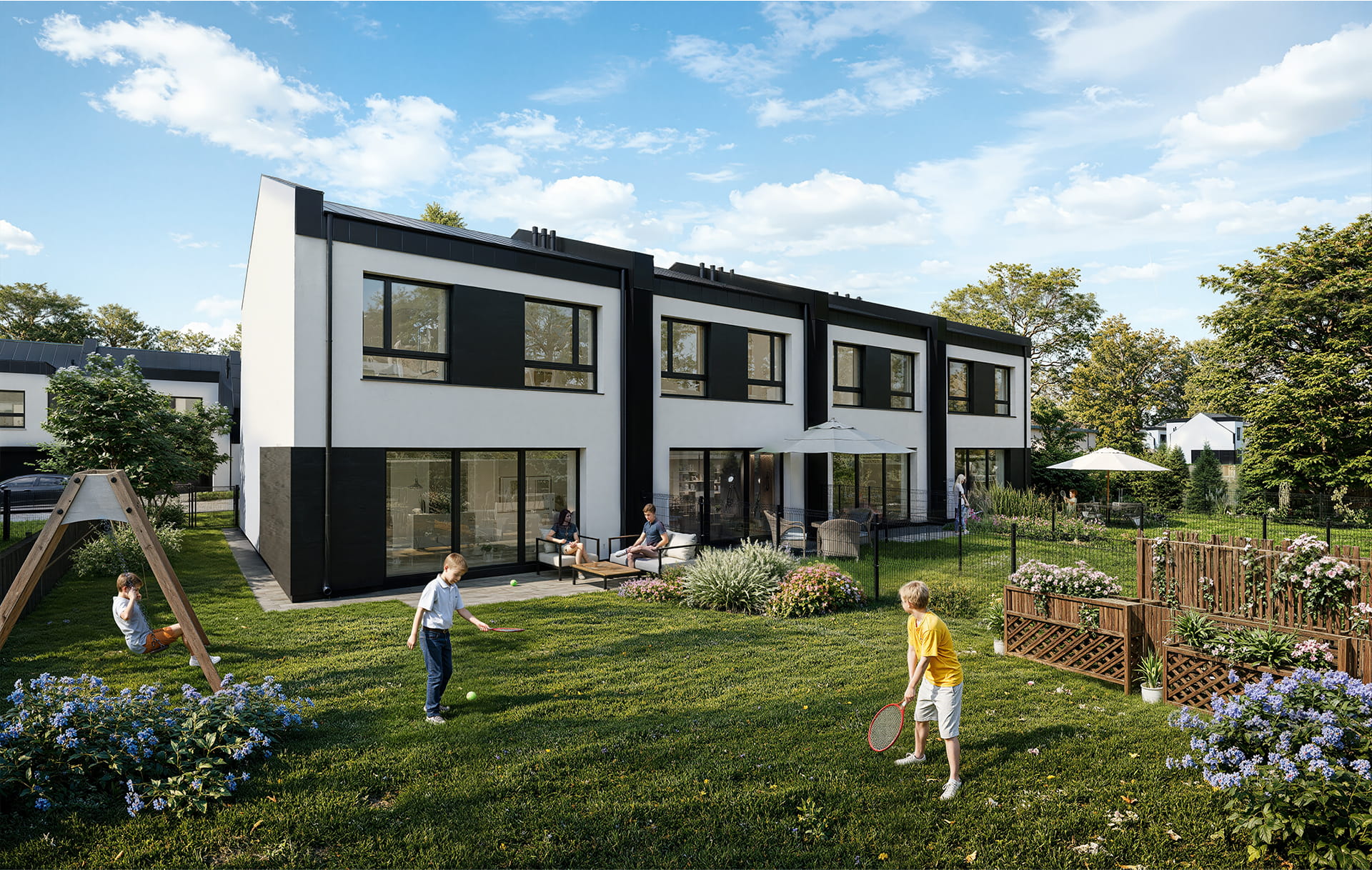 Osiedle wyposażone będzie w wybrukowaną drogę wewnętrzną, a przed każdym domem znajdować będzie się podjazd na samochód i chodnik doprowadzający do drzwi wejściowych. Nasze projekty charakteryzuje funkcjonalny układ pomieszczeń oraz rewelacyjne doświetlenie zapewnione przez duże przeszklenia.